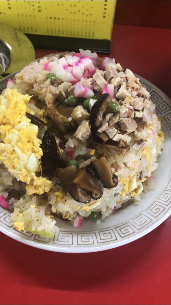 シンプルに塩胡椒で味付けされており、具材とのバランスも絶妙。ご飯はパラパラ系よりしっとりめで、大盛はおそらく2~3合あると思われるボリュームです。個人的には椎茸が嬉しいポイント!