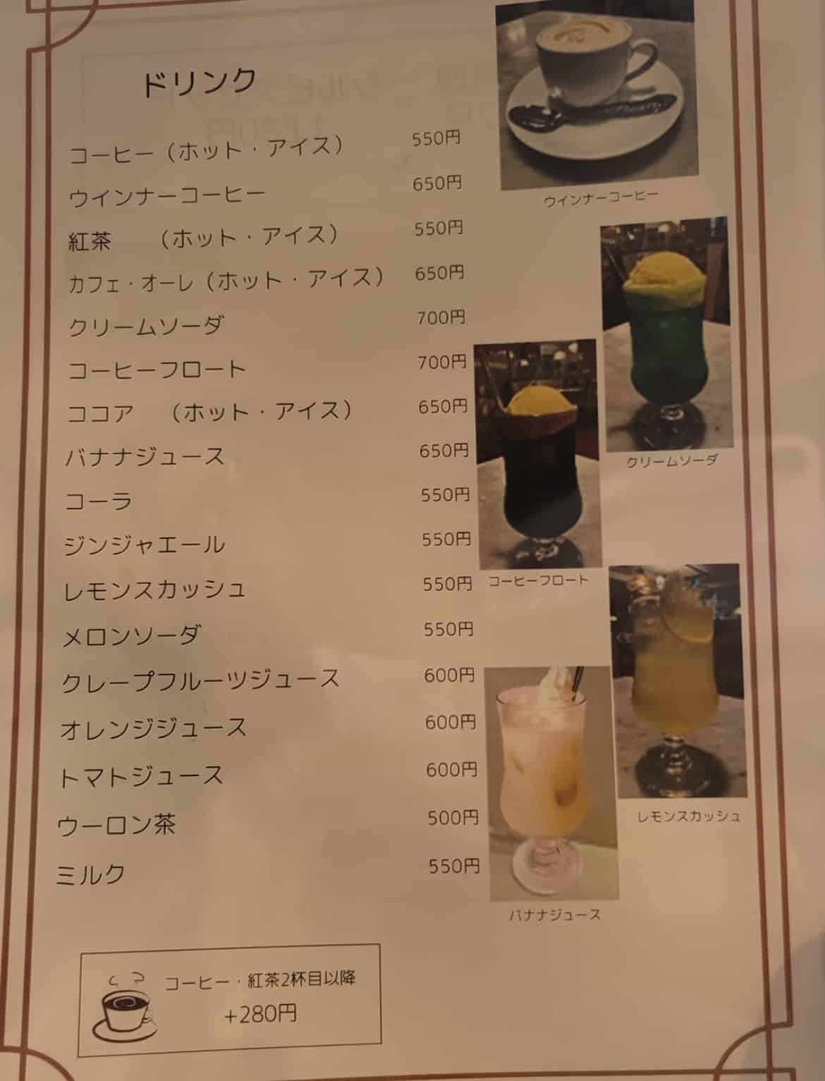 お子様メニューやおつまみ、お酒もあるので、子連れの方や喫茶店飲みにも利用できるのがうれしいポイント。がっつり食事するなら特選メニュー、女子会には映えるクリームソーダなんかが良いでしょう。