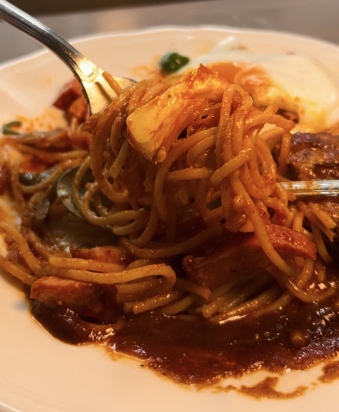 ソースたっぷりのハンバーグに、山盛りのナポリタンは食べ応え抜群。ナポリタンの麺量は最大200gまで選択できるので、今回は200gにしました。また半熟トロトロの目玉焼きとハンバーグを一緒に食べたり、粉チーズでナポリタンを味変したりと大満足!