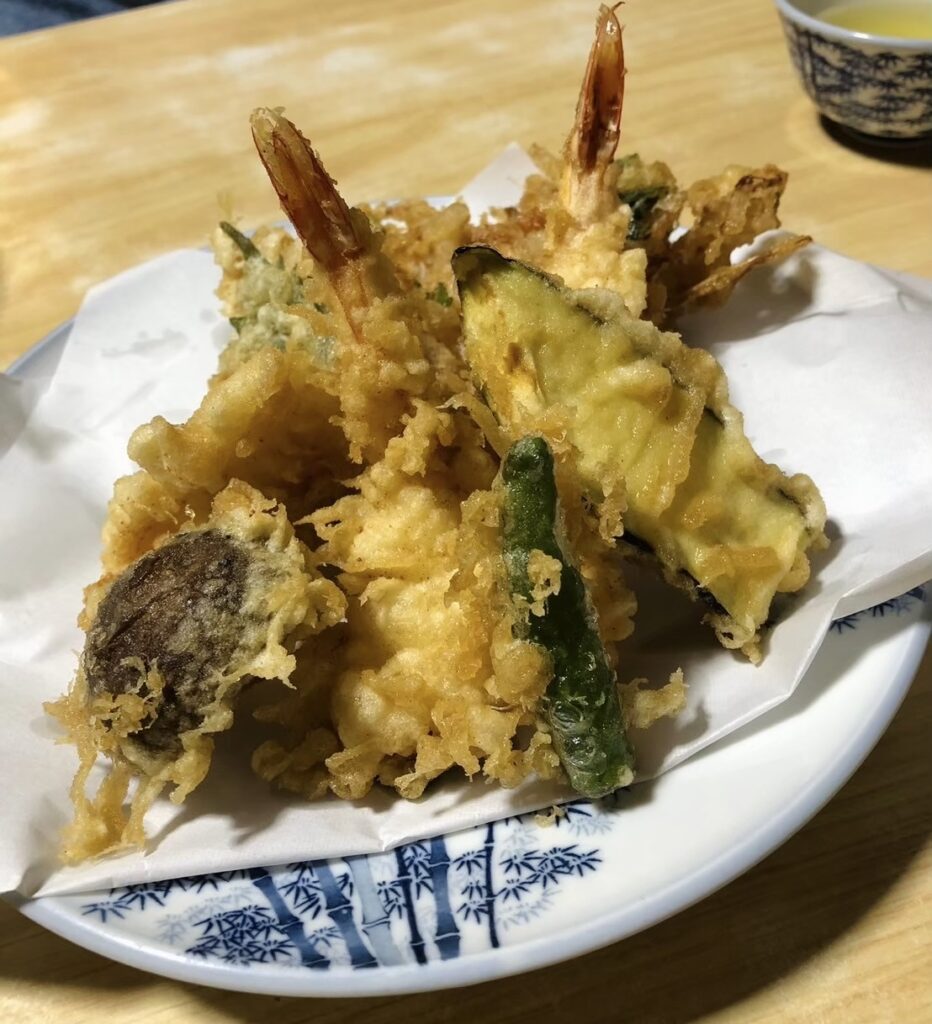 具材は大海老2尾や南瓜、椎茸、紫蘇、かき揚げ、ししとう、キス。ラインナップが異なる場合もあるかもしれません。どのメニューも注文してから揚げてくれるので最後まで大満足です。