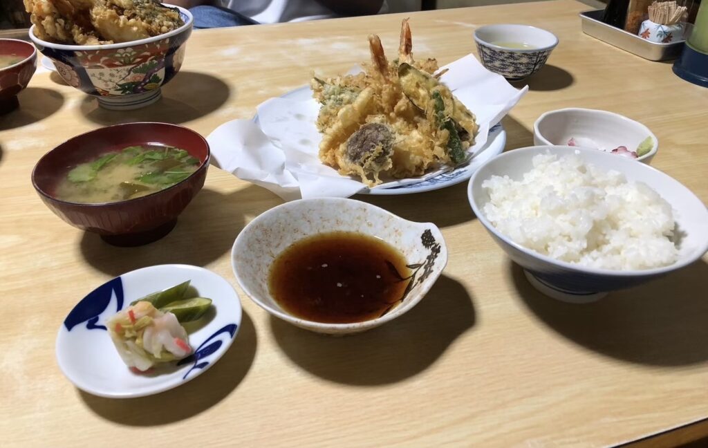 (天ぷら数種類+お刺身まで付いてくる豪華な定食。)