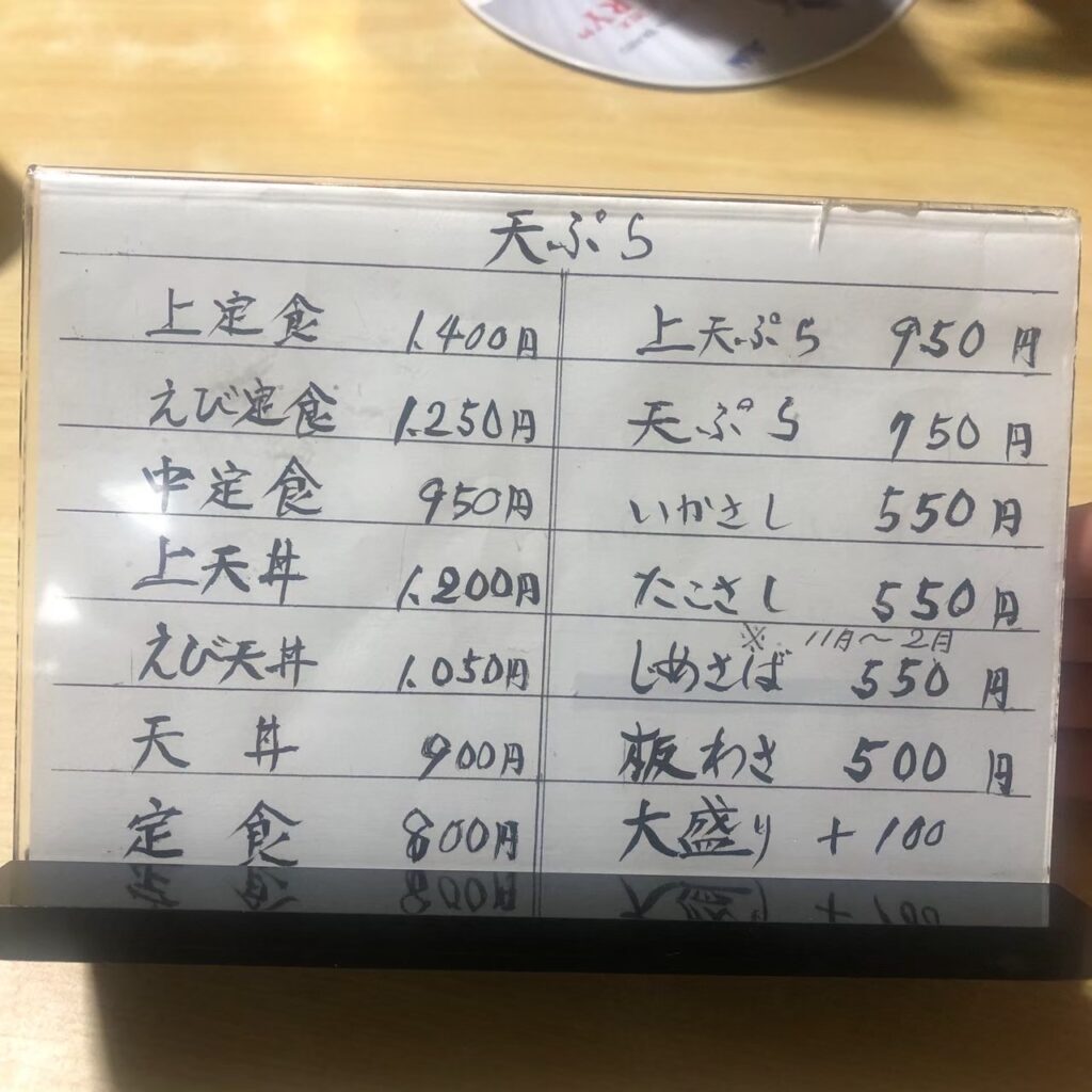 天ぷら屋さんということで、天ぷらメニューだけでも豊富なラインナップ。手書きで記載されたメニューもシンプルで、昔ながらの雰囲気を感じます。